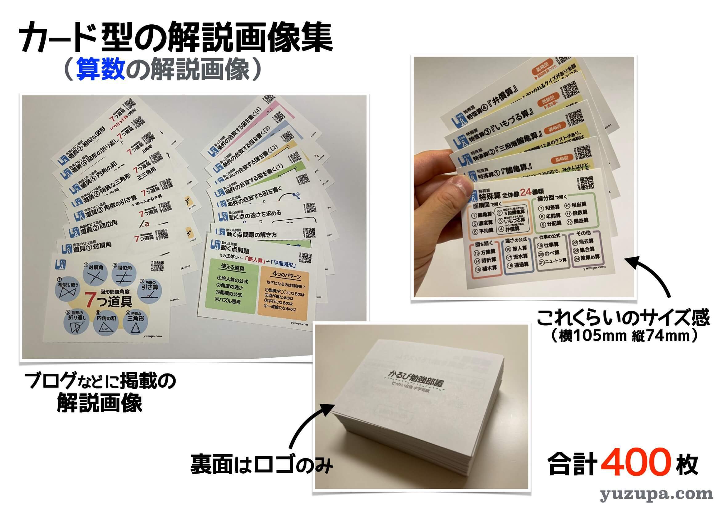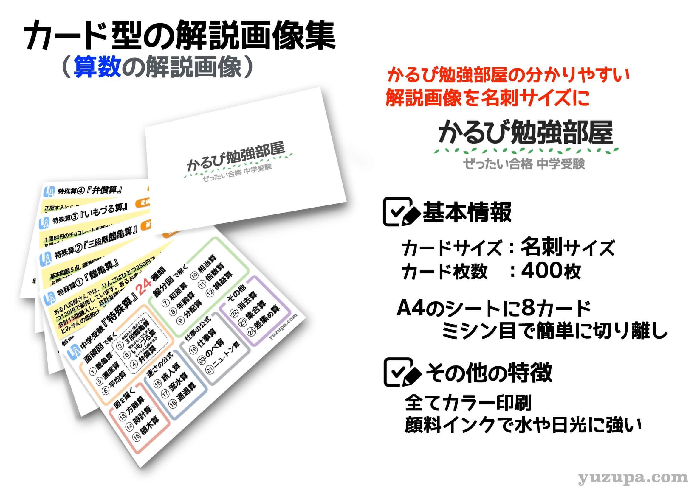 本製品は中学受験の情報発信ブログ「かるび勉強部屋 ( https://yuzupa.com/ )」で公開している記事の中から解説画像を400枚ピックアップしカード型教材として提供する商品となります。